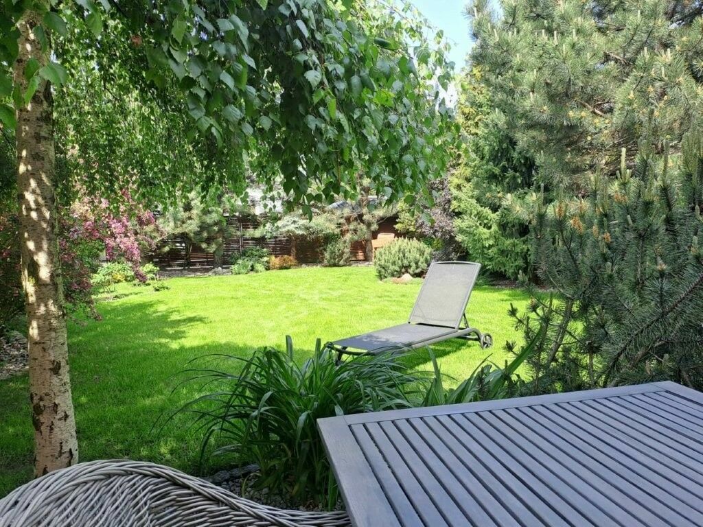 W przydomowym ogrodzie z wieloletnimi nasadzeniami, a także z drenażem i systemem automatycznego podlewania, liczącym około 300 m² dostępny jest drewniany domek ogrodowy ok. 4 m² oraz taras liczący około 20 m².