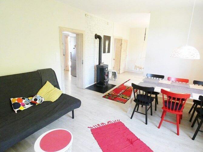Pokój główny z kanapą, stołem na 6 osób, TV, fotelem wiszącym z