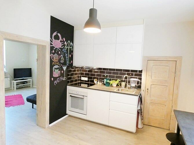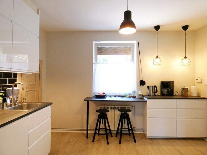 Kuchnia wyposażona w lodówkę, szafki, blat 2 osobowy, zmywarkę,