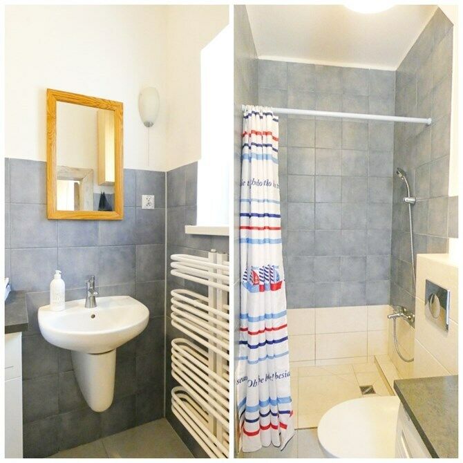 Łazienka na parterze z prysznicem, pralką, umywalką oraz WC.