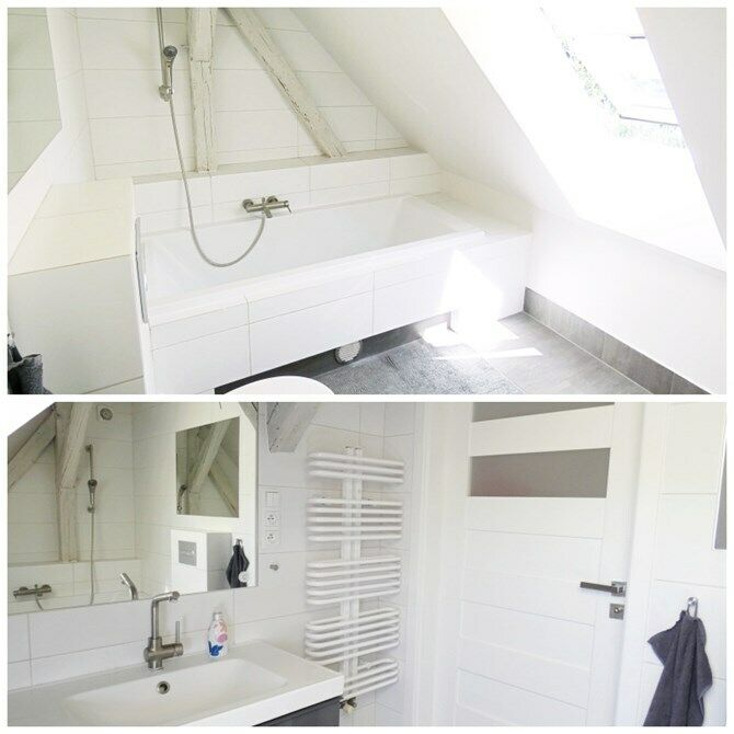 Na piętrze łazienka z wanną, WC oraz umywalką. Jeden z pokoi