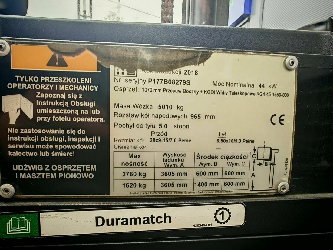 WYPOSAŻENIE: KABINA Z OGRZEWANIEM I KLIMATYZACJĄ, MASZT DUPLEX, PRZESUW BOCZNY WIDEŁ, OPONY SUPERELASTYCZNE.